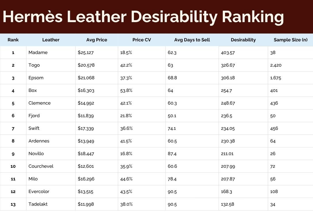 The goal? To understand which leathers actually perform best when it comes to price, market liquidity, and predictability. Because in the world of Hermès, desirability isn’t just about aesthetics—it’s a matter of what sells, at what price, and how quickly.